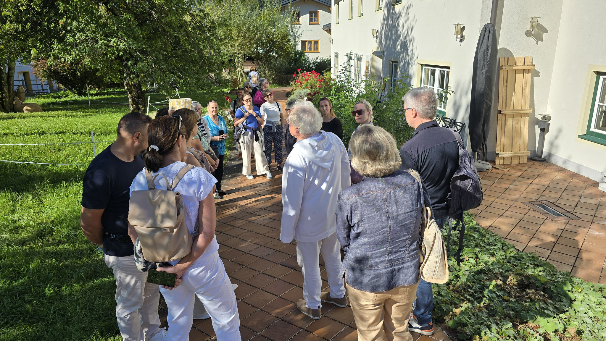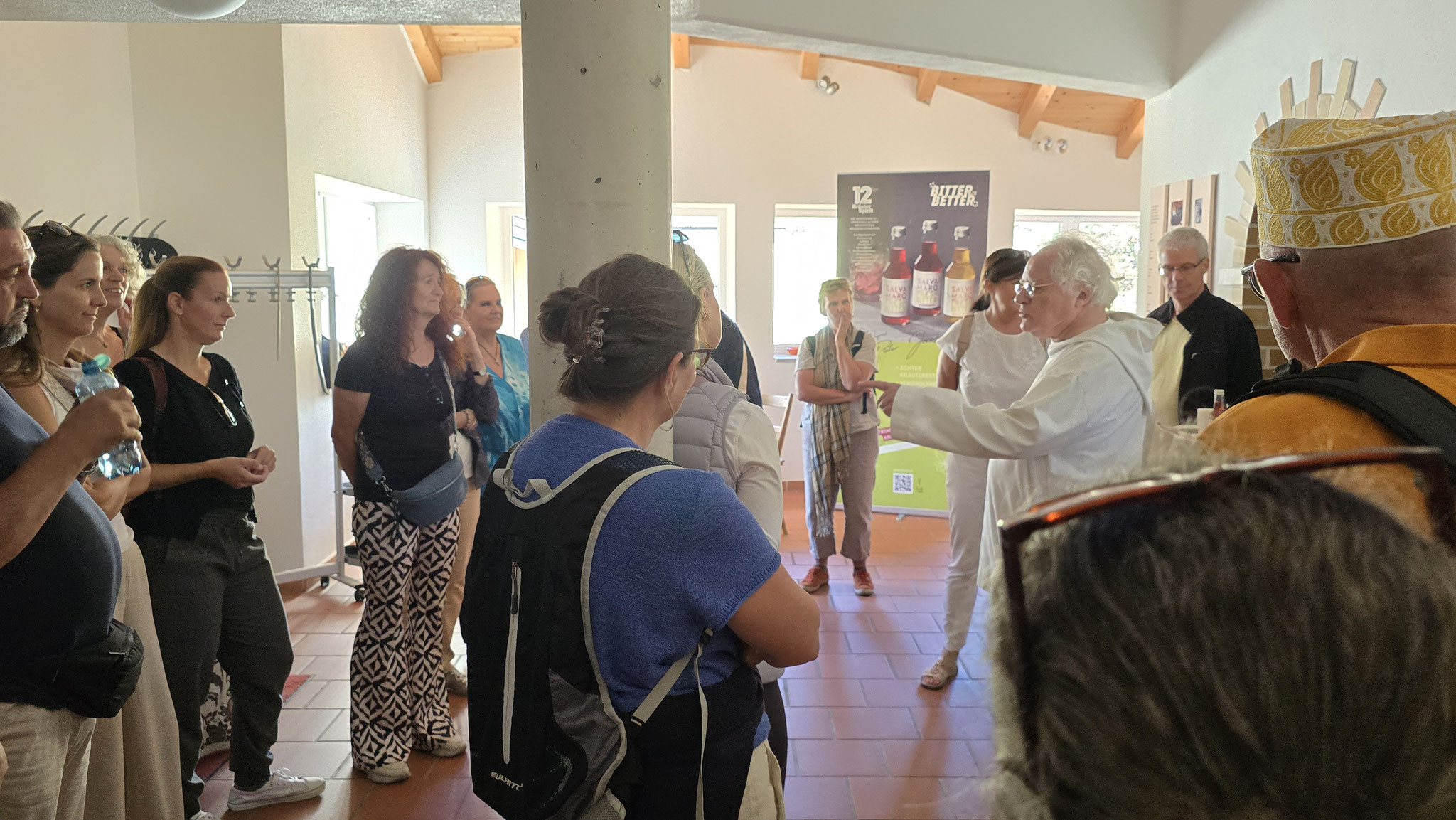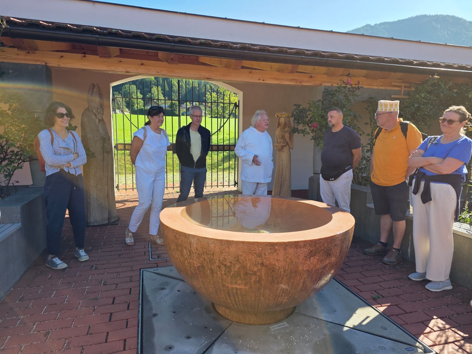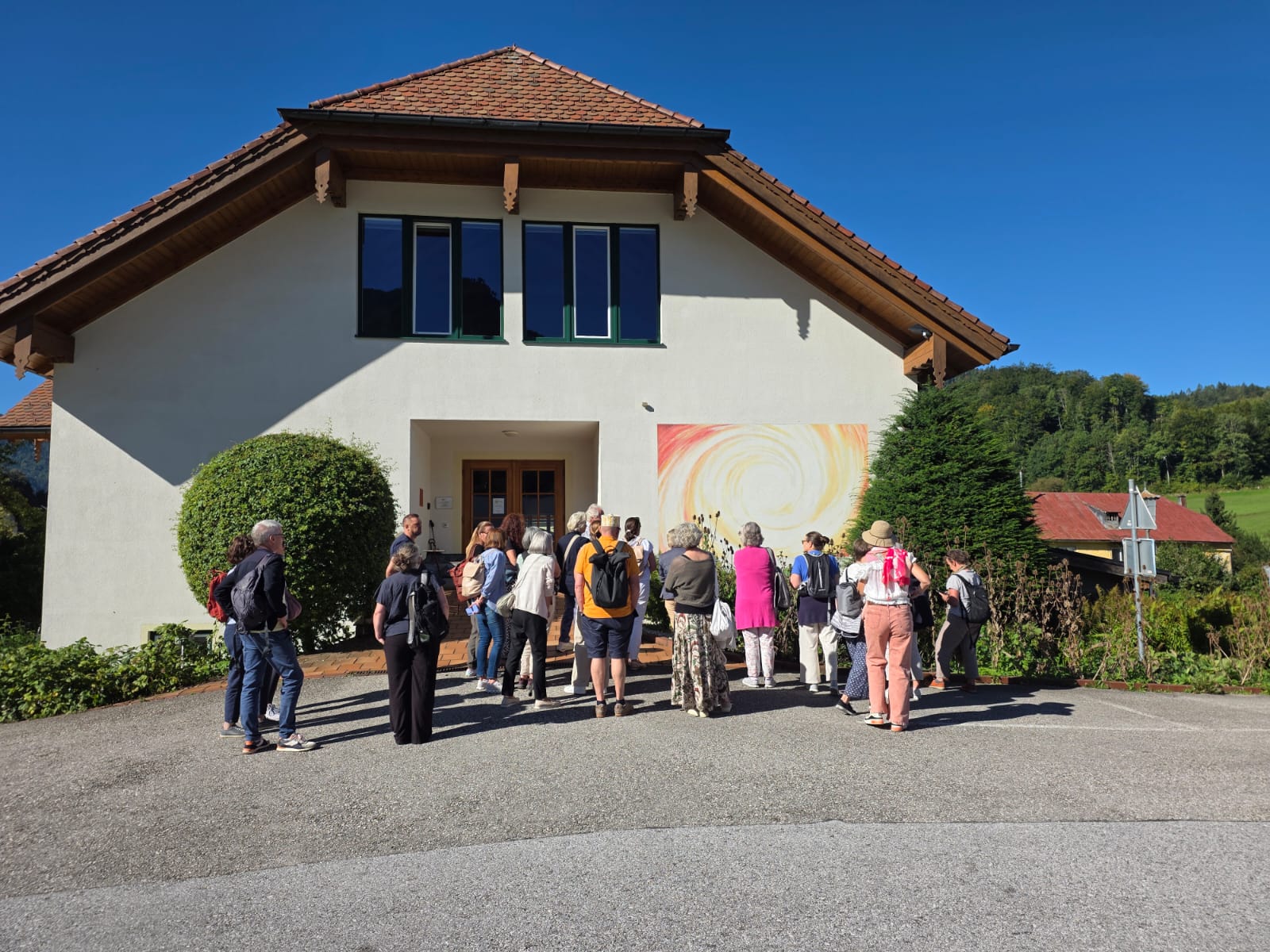 Rainer hatte ja das Preisgeld in Höhe von EUR 3.000,-, mit dem der Wüstenrot sein freiwilliges soziales Engagement im Hospiz ausgezeichnet hatte, dem Verein übergeben. Eine erste Aktivität war der gemeinsame Ausflug von Mitarbeiter*innen und Ehrenamtlichen am Samstag, den 20. September an den Wolfgangsee. Bei wunderbaren Wetter startete der Tag mit einem Besuch des Europa Klosters Gut Aich. Gründer, Pater Johannes Pausch, führte unsere Gruppe durch sein Lebenswerk. Von der wunderschönen Kapelle bis hin zum Kräutergarten - zu allem gab es spannende Geschichten zu erzählen und die Zeit verging wie im Fluge. Zu Fuss wurde dann die nächste Etappe vom Kloster bis zum Gasthof Fürberg flott erledigt, wo ein sehr feines Mittagessen auf alle Teilnehmer*innen wartete. Frisch gestärkt ging es anschliessend per Schiff noch weiter nach St. Wolfgang.